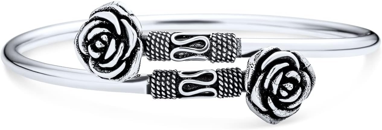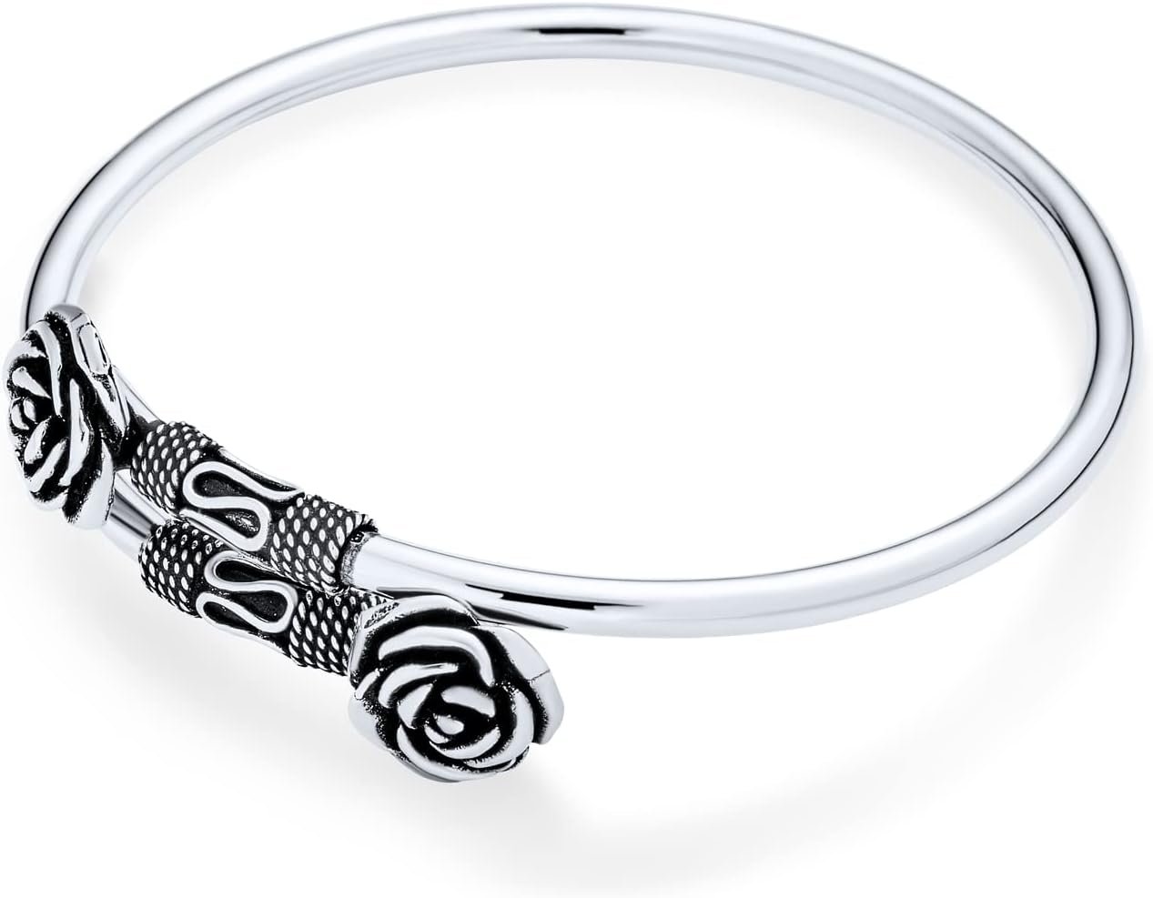 Balinese Bali Style Flower Ball Tips Bypass Stacking Black Rose Bangle Cuff Bracelet For Women Teen Oxidized . Sterling Silver