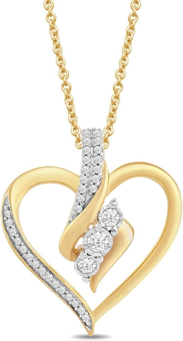 - STYLE: This stunning 1/4 cttw yellow gold over sterling silver necklace featuring a diamond-accented open heart pendant with a hanging trio of diamonds at center; pendant is 27mm long and 21mm wide on an 18″ rolo chain