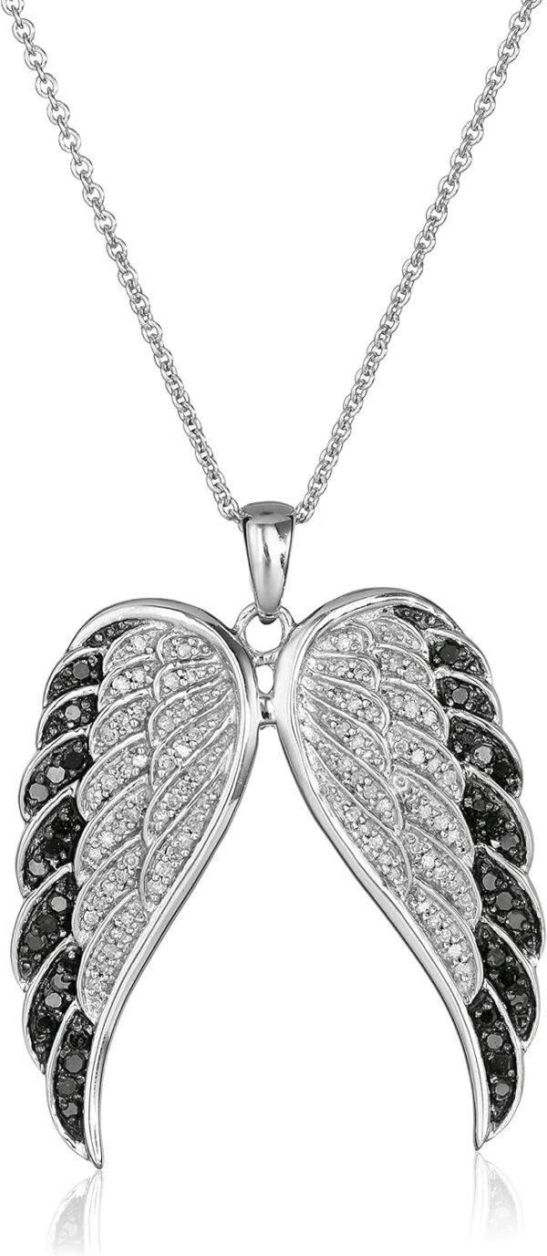 - STYLE: Serene 1/2 cttw sterling silver necklace features an angel wings pendant studded with sparkling black and white diamonds 26.4 mm in width and 34.62mm in length on an 18″ rolo chain